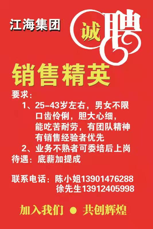 江海集团招人啦！！诚聘销售精英！！要求：1、25-43岁左右，男女不限，口齿伶俐，胆大心细，能吃苦耐劳，有···